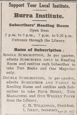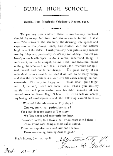 Burra High School Speech Night was held at the Institute on Thursday for the first time since the school was started in 1913. Previous break-up celebrations had taken place at the school. Mr E.W. Crewes presided in the absence of the chairman of the School Board Mr J.E.H. Winnall who was ill. The headmaster Mr Biddle addressed the meeting. He traced the history of the school, which opened 30 January 1913, headed by Mr J.W. Statton who 2½ years later enlisted for active service. The average attendance for the nine years was 24 and it was the smallest High School in SA with but one teacher. The small size is partly due to the difficulty of getting into town from the district, but there were enough young people for 40-60 if people valued education. Mr Biddle complained that many students left before completing the course and for that he believed the blame rested with the parents. A laboratory and library have now been established. If the school does not receive better support it is the intention of the Director of Education to close it and add one grade to the Primary School.